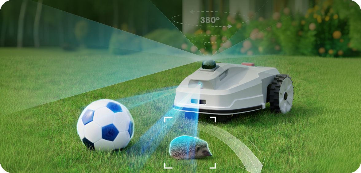 Offers 360° LiDAR sensing and physical bumpers to keep mowing safe.